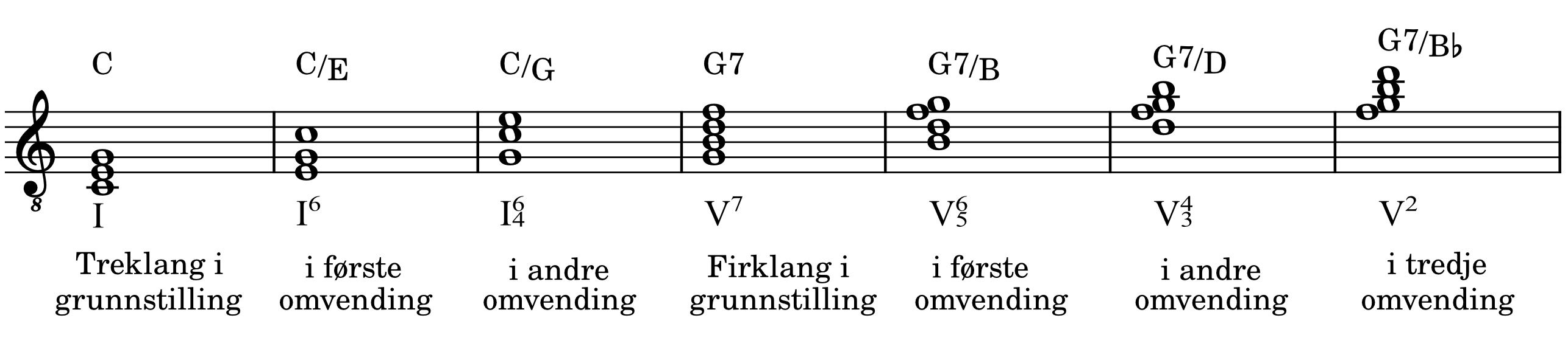 Alle eksemplene er her gitt i C-dur. Her er en oversikt over treklangene i C-dur