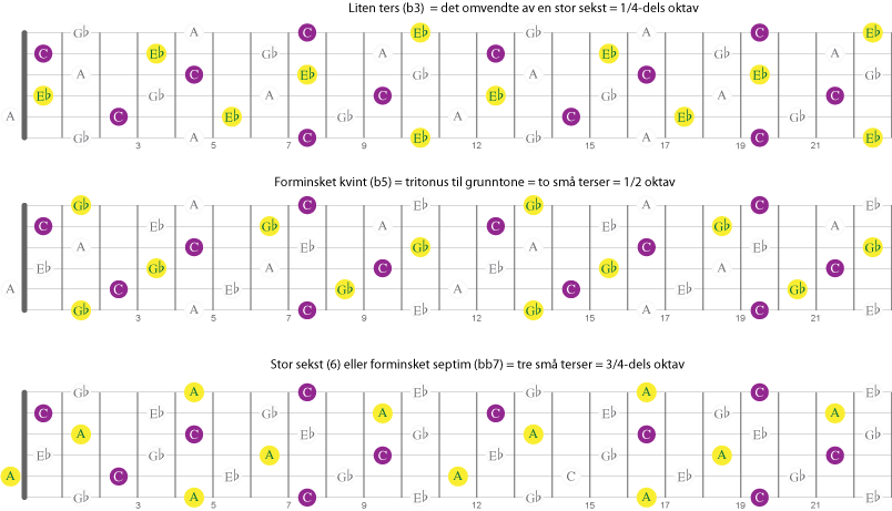 Merk at det gjelder å bli bevisst på hvilke intervaller og toner du må flytte for å gå fra en til en annen akkord, så kan du utfra de fem dim7-akkordene da huske.
