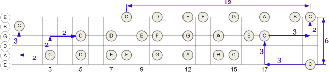 Oktaver på gitarhalsen: Illustrasjonen viser hvor du finner c-durskalaene på 5., 3. og 1. streng. Merk deg at det er seks oktavrelasjonene. Hva som er forskjellen på dem? For eksempel kan du finne en oktav fra femte streng (A-strengen) ved å gå to bånd tilbake og tre strenger opp, eller ved å gå to strenger opp, og to bånd opp, eller ved å gå tolv bånd opp…