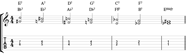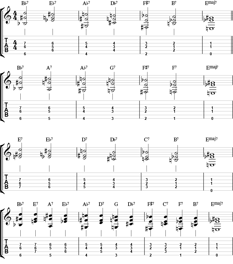 I andre linje har B7, A7, og G7 blitt erstattet med henholdsvis F7, Eb7 og Db7. I tredje linje har F#7, E7 og D7 blitt erstattet av C7, Bb7 og Ab7. Prøv selv å erstatte første linje med C7, F7, Bb7, Eb7, Ab7, Db7…